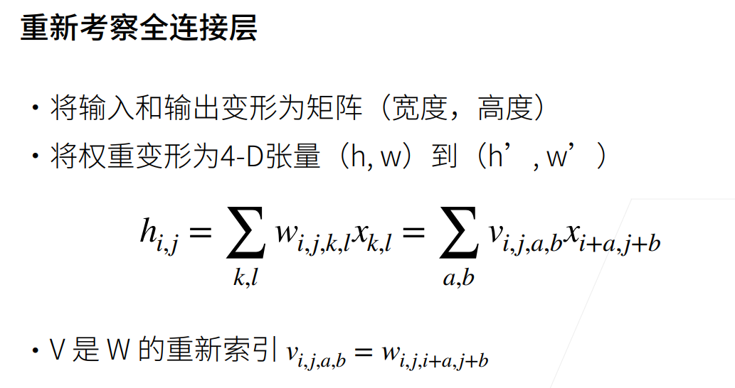 因为我们认为图像输入区域的改变并不会导致我们在处理图像时的操作发生变化,那么使用平移不变性,让输入的平移不影响权重$v$ 。效果是将一个4维张量压成了一个2维的张量。