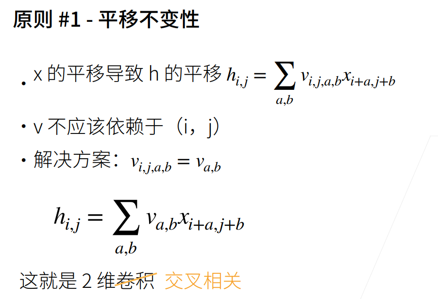 当我们对于一个较大的图片进行计算时,使用之前的全连接层会占用大量的空间,因此我们由图像的性质引申出来两个重要的处理原则:平移不变性和局部性。