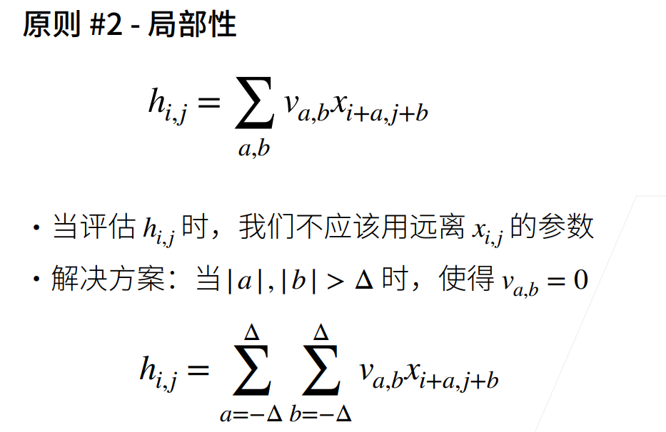 同时,很多时候我们并不会特别关注完整图像的输入而是更多考虑一些局部的输入,此时我们采用局部性,将处理区域限制在一个范围之内。