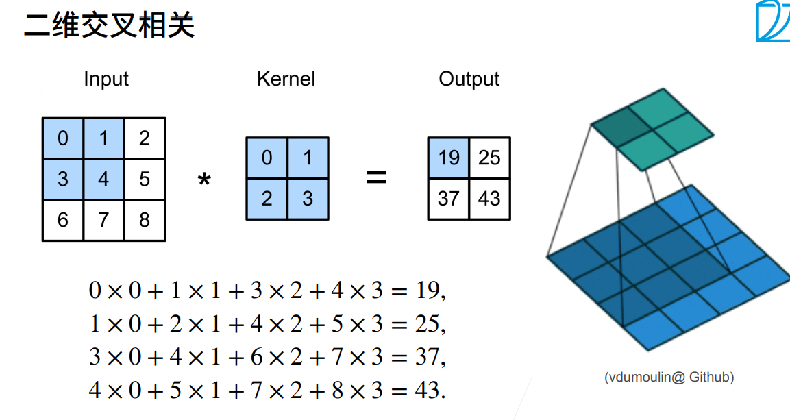 - 输出 $\mathbf{Y}=(n_h-k_h+1)\times (n_w-k_w+1)$ 。