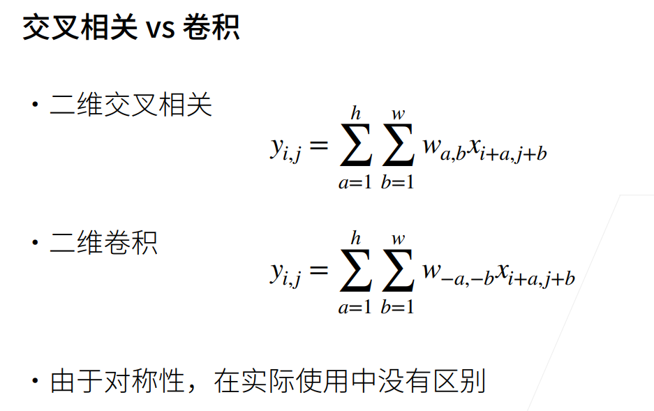 卷积和数学上的交叉相关本质上是一样的,两者都是对称的。 卷积计算的输入输出和过程遵循: