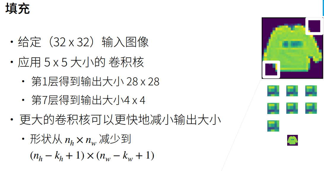 填充(Padding)和步幅(Stride) 控制了卷积层输出的大小,使用一个 $n\times n$ 的核对输入进行一次卷积之后,会将输入的大小减少 $n-1 \times n-1$ 。