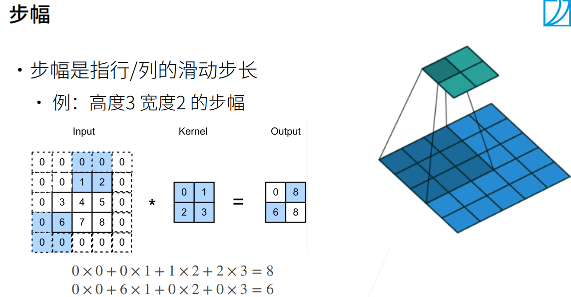 如果遇到较大的矩阵,并且不使用较大核的情况下(一般的核都是 $3\times 3或5\times 5$),计算就需要非常多步才能完成。那么此时我们可以对步幅进行调整,也就是一次上下/左右移动移动2格或者更多,这样也能减少计算的次数。