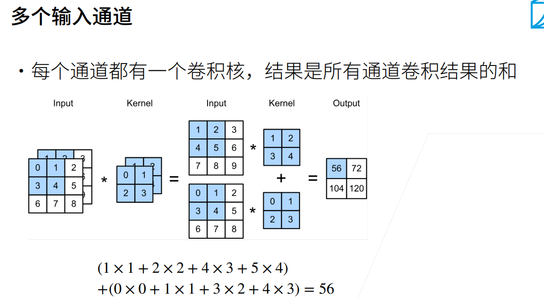当我们对多个输入通道进行卷积操作时,每个通道都对应一个卷积核。多个卷积核组成一个三维的卷积核,即 $c_i\times k_h\times k_w$ ,$c_i$ 为通道数。且最终结果都是单输出通道。