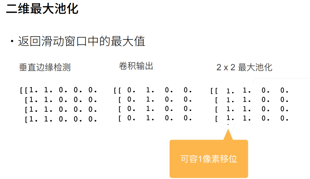 通过结果我们可以看到,池化后的卷积输出出现了一定的移位。说明实现了一定程度的平移不变性,这里的平移不变性指的是对于输入输出结果来说,而不是针对卷积核平移时的不变。
