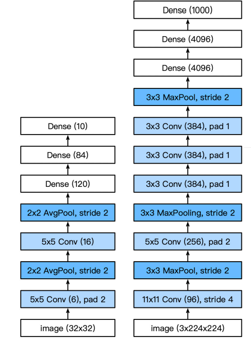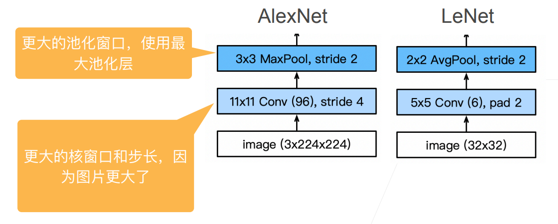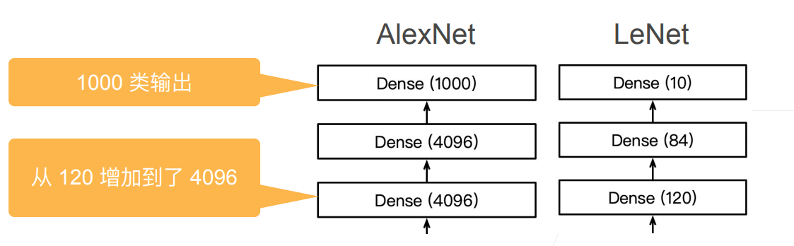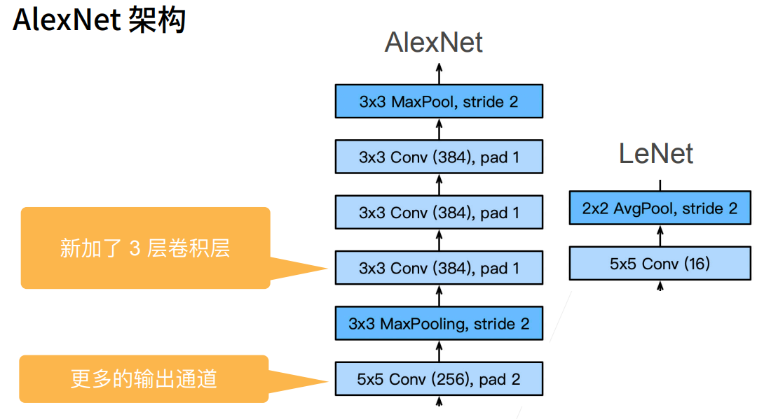 AlexNet并没有做出很本质上的改变,架构逻辑还是和LeNet是一样的。具体改变如下: