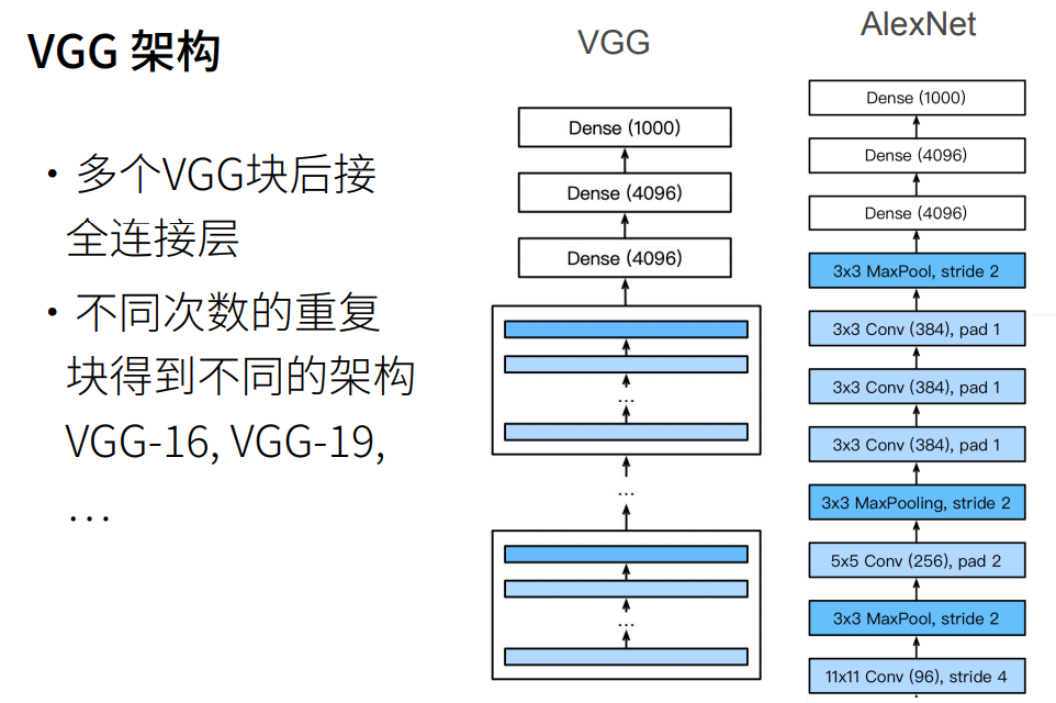 VGG考虑的很简单,能不能通过更深更大来让AlexNet更好。但是全连接层太贵了,所以采用更多的卷积层。 一个简单的想法就是将AlexNet的一部分用一个块来呈现,且这个块可以重复、可以自定义。 然后构建更大更深的深度卷积神经网络。