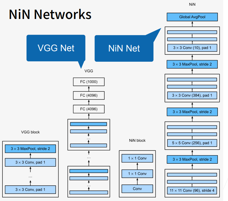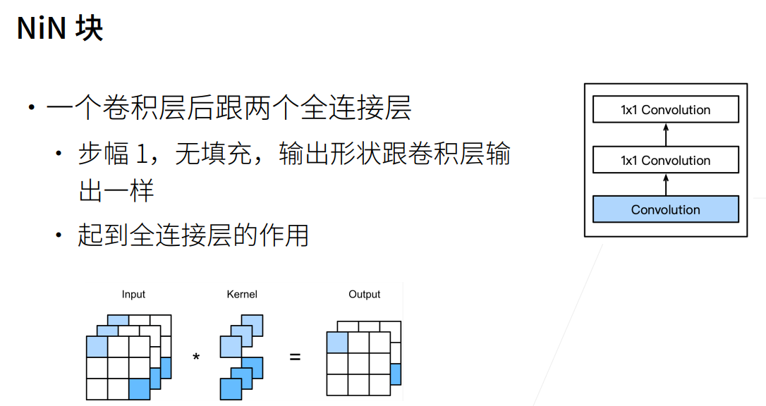 NiN这个比较简单的架构使得他无法去学习原本全连接层中很多的参数,也就没那么容易过拟合。并且还显著减少了权重参数的大小。