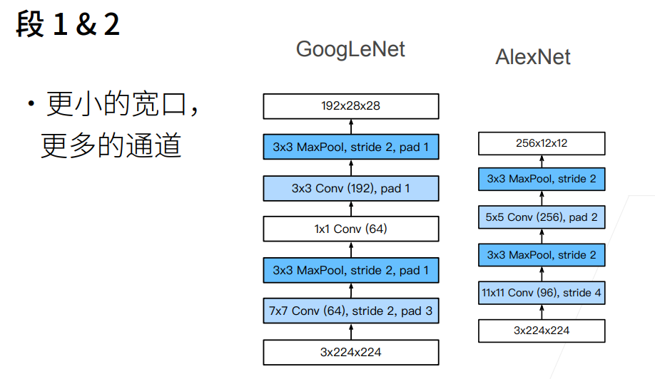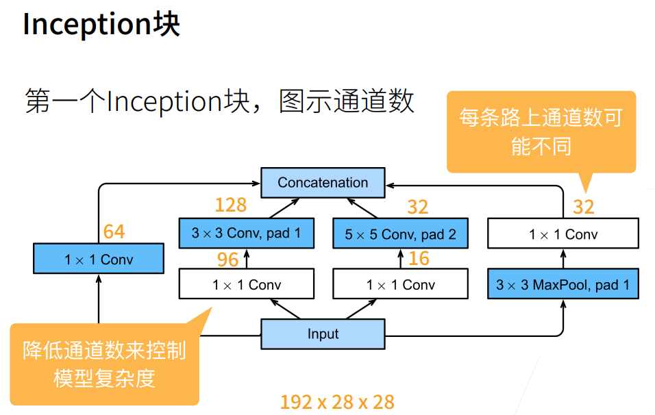 白色部分的框可以理解为用于减少通道数来控制模型复杂度,蓝色部分的框用于提取重要特征。并且可能因为 $3\times 3$ 的卷积核效果比较好,所以分配给他多一点的信息(通道)。最后实现了一个参数更少计算速度更快的网络。这也是Inception块的主要优点:模型参数小,计算复杂度低。