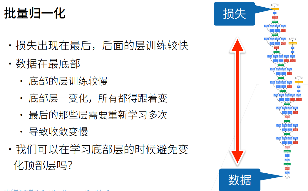 BN其实是可以理解为是在每个小批量中加入噪音,也就是每个小批量对应的 $\mu_B$ 随机偏移,和 $\sigma_B$ 随机缩放。基本固定住小批量的均值和方差之后再让模型学习出合适的偏移和缩放。引入噪声的这个操作被公认为具有正则化效应,因此也不用再使用丢弃层。
