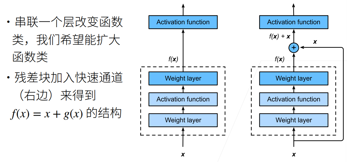 加更多的层并不能总是改进精度,因为更多的层串联(复合函数关系 $y = f_n(…f_1(x))$ )虽然能让机器学习到更多的信息,但是也更可能过拟合并且跑偏,左图。但是假如我们能让越深的层学习到的内容尽可能的在之前的内容当中,也就是呈现嵌套的关系($\mathcal{F}_1 \subseteq \dots \subseteq \mathcal{F}_6$),那么模型只会更好不会变差。