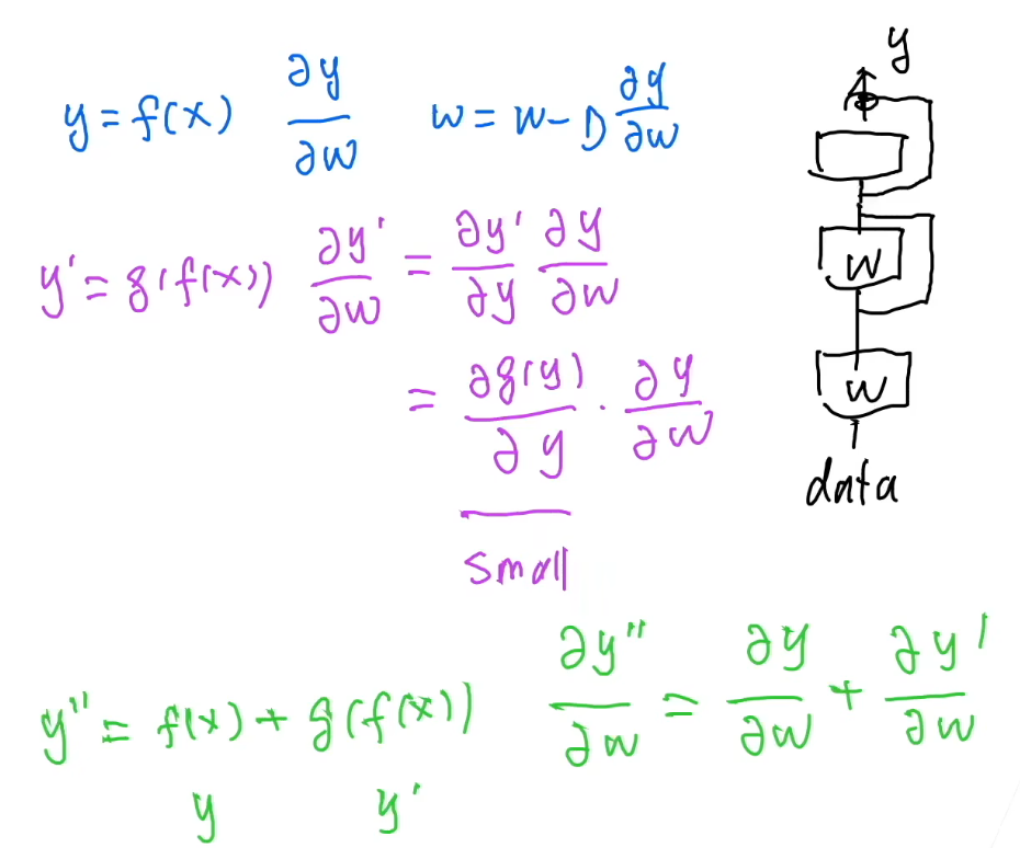 绿色部分是ResNet实现的函数表示,蓝色和紫色部分则是前两层的表示。 重点是在对于靠近data的难训练的权重,我们使用的加法可以避免梯度一直通过链式法则不断相乘导致不稳定,而是可以保证总是有一个加法因子来保障之前优秀的训练权重作为兜底。这样能很好地避免训练方向走偏,以及过拟合。