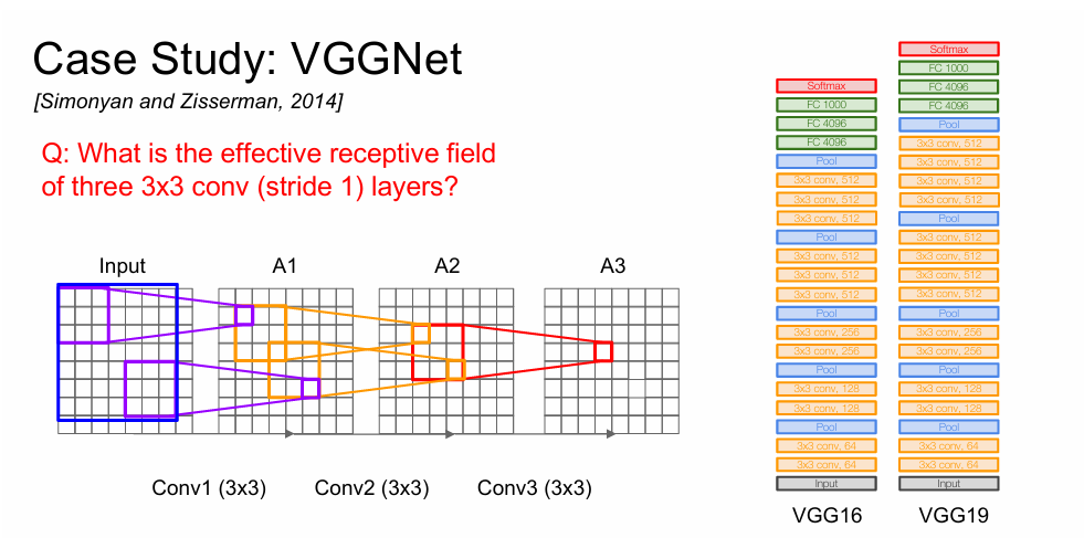 如下图,从结果来看,更多更小的卷积核和更少更大的卷积核最终的感受野其实是一样的,但是更多的层能带来更多的非线性性。