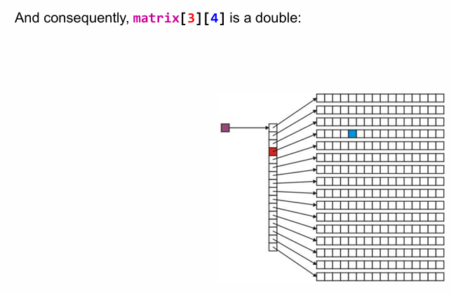 如果现在需要找到 matrix[3][4] :matrix 指向首个数组指针,3为索引为3数组的指针,4为第四个数组指针的索引为5元素。