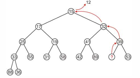 pop操作,弹出根节点(12)后,就需要将根节点子树中最小的节点(15)上提,用其替代原来根节点位置(12),即导致下面的不完全树。
