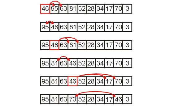 使用最小堆:将 $n$ 个对象插入一个最小堆,然后连续取出 $n$ 个对象,它们会按顺序出来。这个取出 $n$ 个对象的操作需要 $O(n \ln(n))$ 的时间。 但是,使用最小堆来进行操作会需要额外的一个大小为 n 的堆来存放,这会消耗内存,因此也不是我们想要的 in-place (就地)的算法;