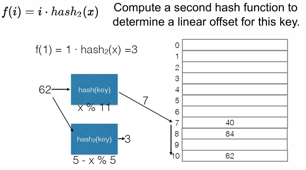 再考虑变形:$f(i)=i\cdot hash_2(x)$ 来使用二次哈希进行相同 hash 值的计算与偏移。P60