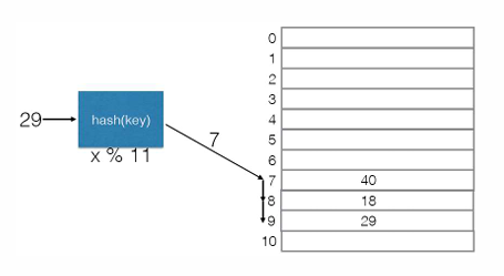 当我们将一个key hash后,哈希值发生碰撞,那么就移动到这个哈希值(索引)后面的某个空位置。